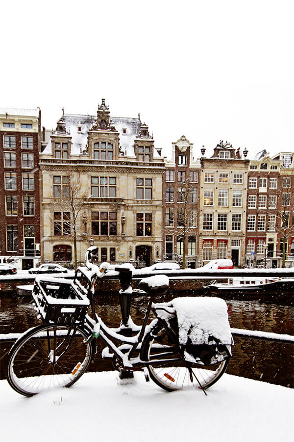 It rarely snows in Amsterdam and prior to last year, the canals in Amsterdam had not become frozen over for eight years. That said, it’s good to avoid biking in Amsterdam if it drops below freezing as biking on cobblestones can be dangerous, especially if you’re not an experienced bicyclist, and you can slide on black ice… Typically, Amsterdam bikes do not have snow tires.