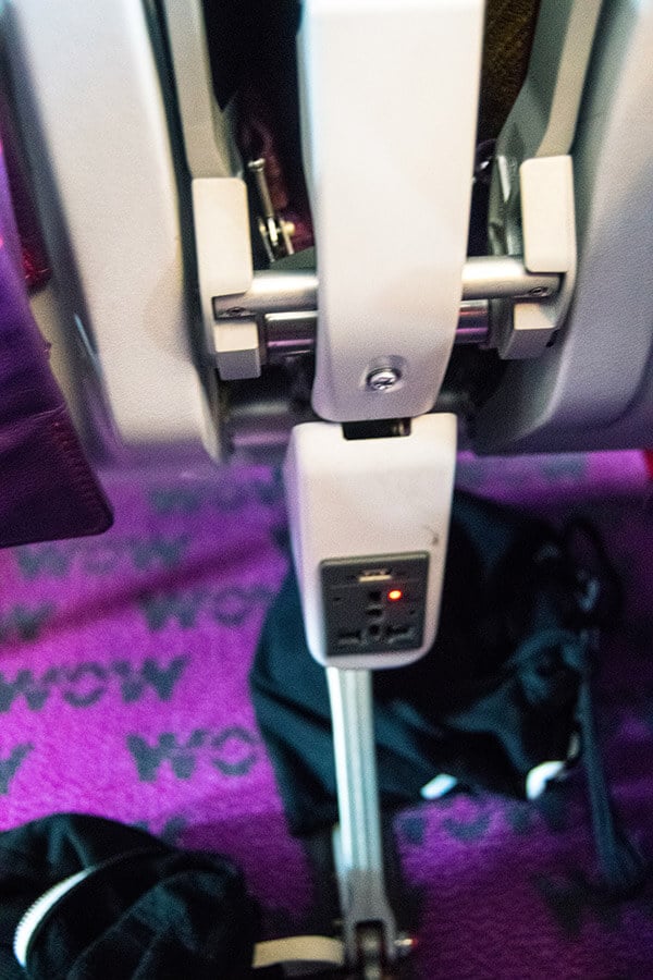 One really nice feature of our WOW flight were the outlets for electronics, including a USB port. There’s also a little shelf where you can put your phone securely to watch movies or television shows on. There’s a reading light above and I ended up reading for most of my flight. The plug is fitted for European and American plugs.